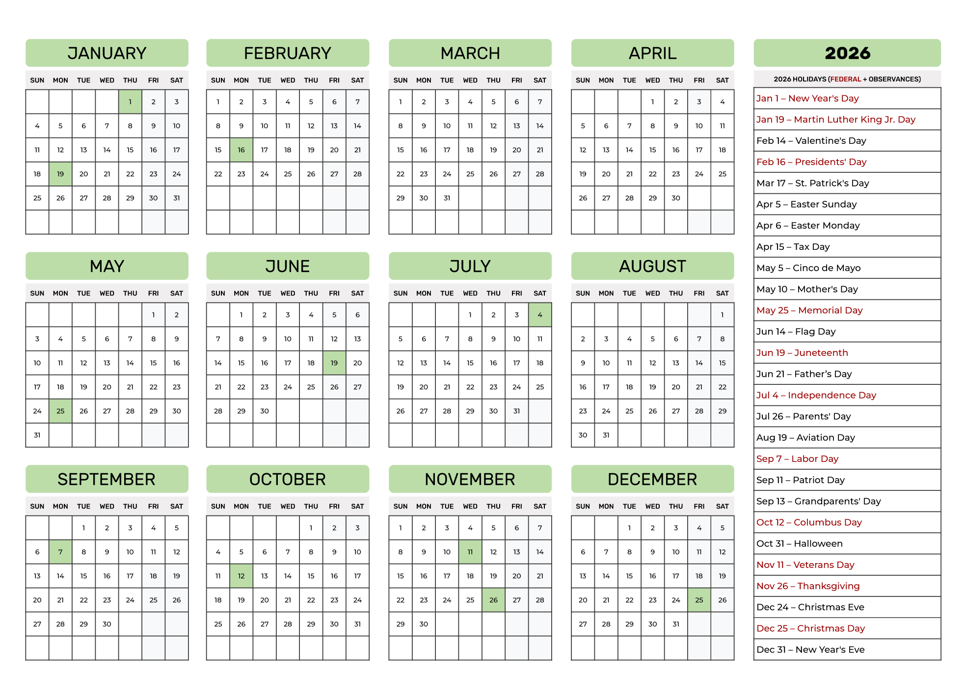 Stay prepared throughout the year with a printable calendar that highlights monthly holidays, deadlines, notes, events, meetings, birthdays, and appointments.