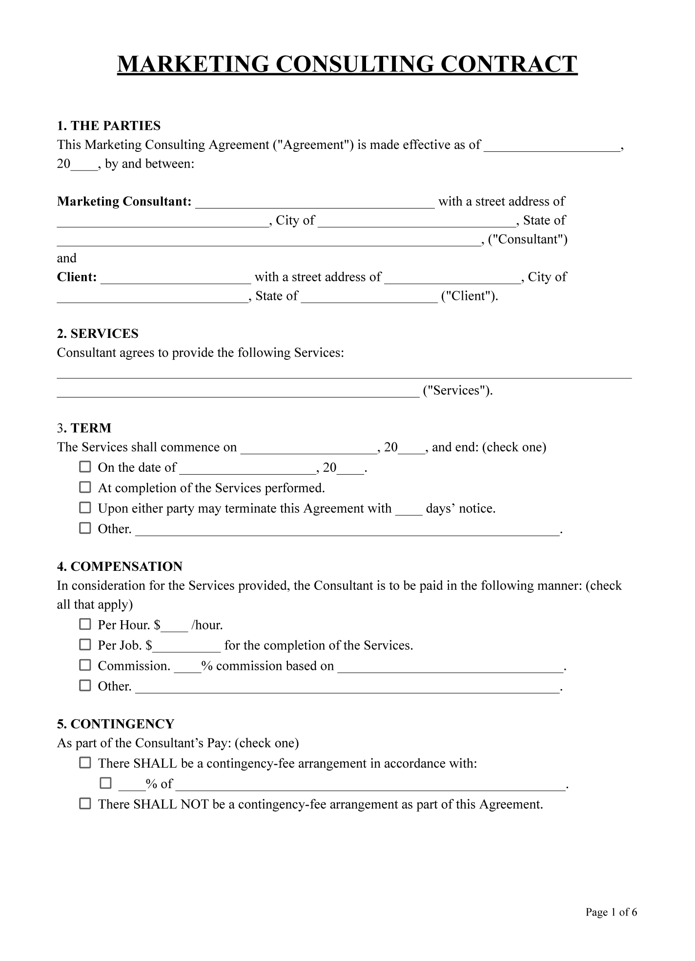 Set the tone for a successful partnership with a marketing consulting contract that highlights goals and mutual expectations.