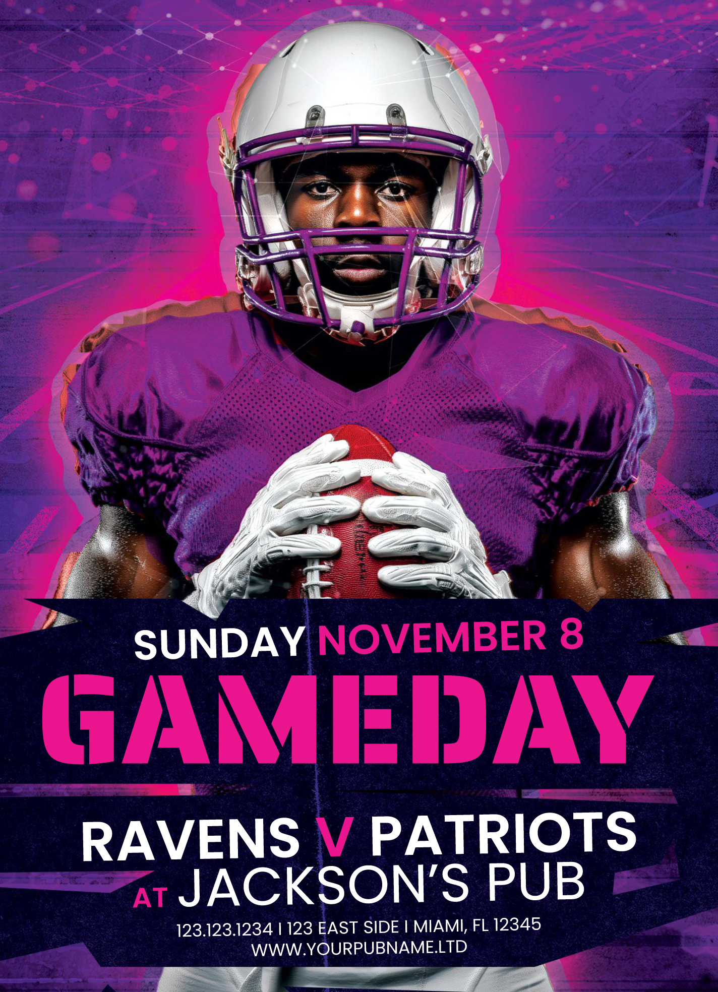This flyer is perfect for sports bars, watch parties, and game day events. Its strong visual structure makes key details easy to notice at a glance.