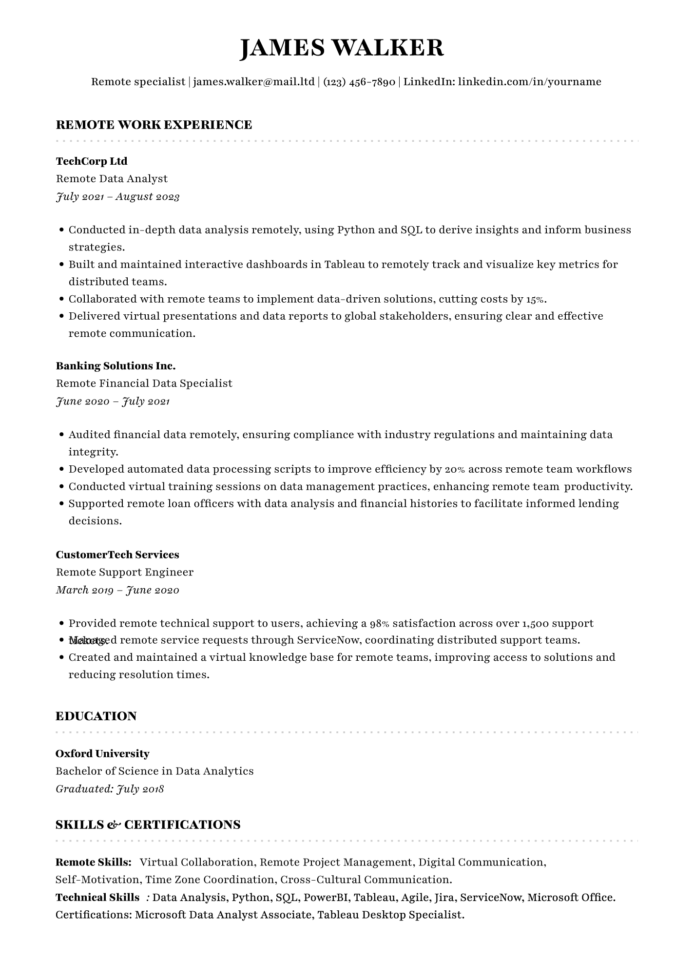 This free template is built for individuals looking to make a mark in the remote job market. Highlight your tech skills and remote work history with ease using Google Docs.