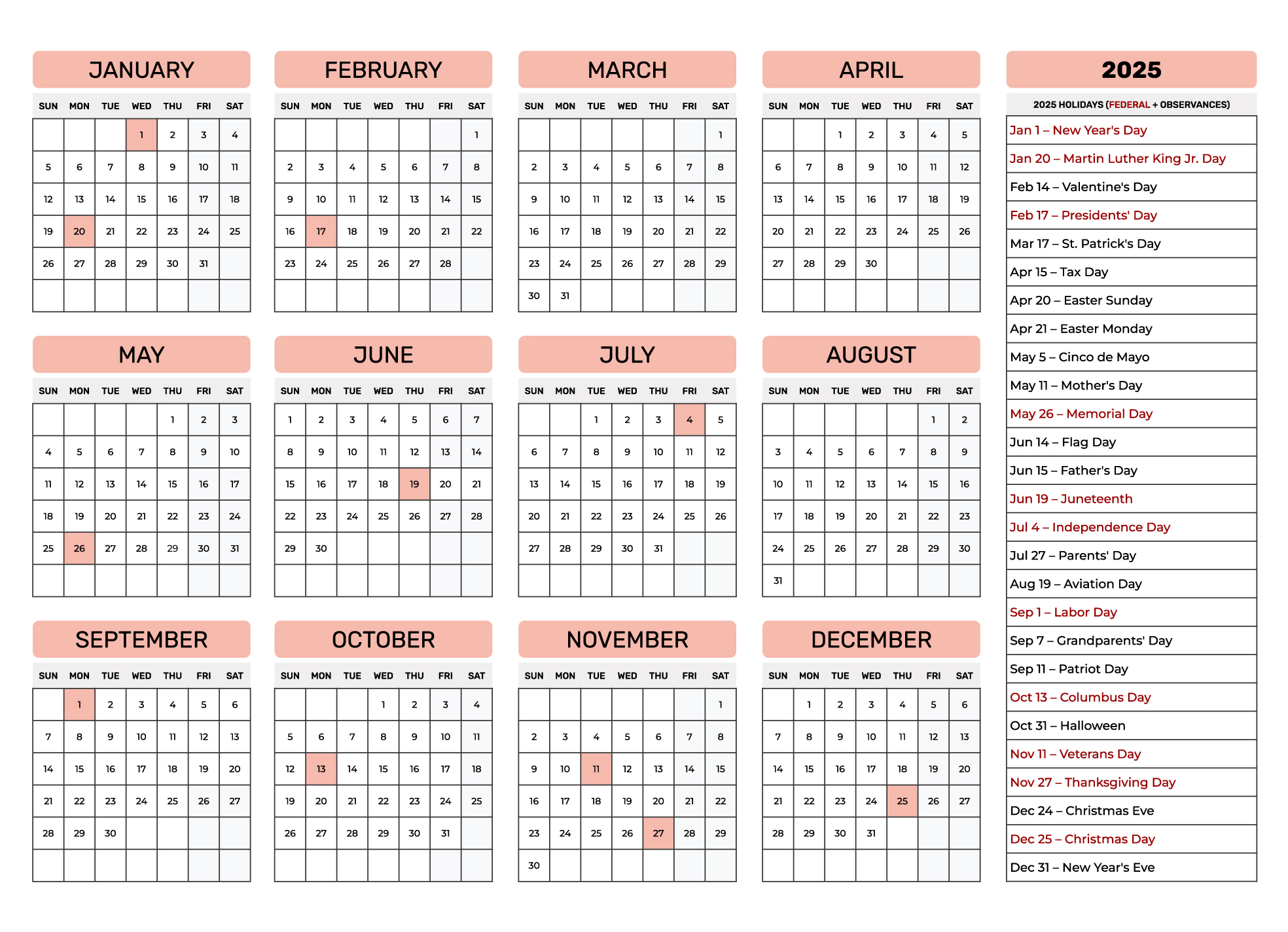 Stay prepared throughout the year with a printable calendar that highlights monthly holidays, deadlines, notes, events, meetings, birthdays, and appointments.