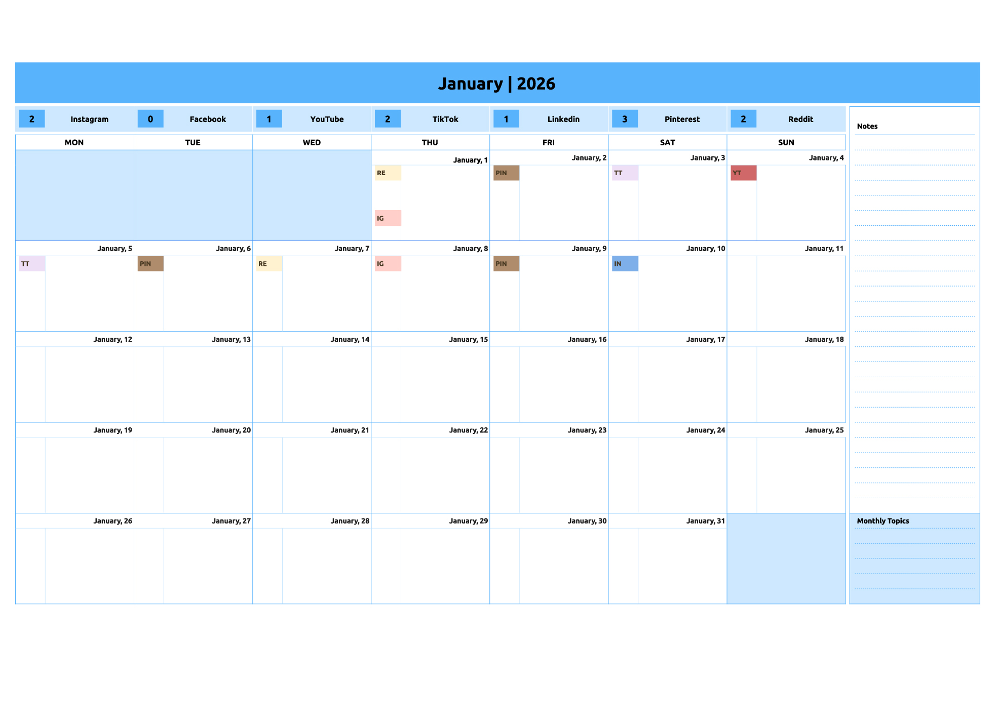 Boost your productivity with our content calendar template. It provides a comprehensive layout to plan your content strategy, making it easier to stay organized and meet your publishing goals.